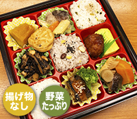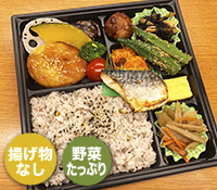 ![]() お店でも人気の豆腐ハンバーグにグリル野菜、焼き魚、和惣菜を盛り合わせ、ヘルシーな幕の内弁当に仕上げました。 1,150円(税込)